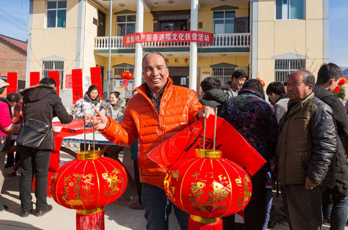 2月2日下午,书法家们来到涝峪口村,摆开笔墨,泼墨挥毫,闻讯赶来的村民络绎不绝。“天增岁月人增寿,春满乾坤福满门”,“新春富贵年年好,佳岁平安步步高”……一幅幅红艳艳寓意平安、祝福美好的春联,得到了村民们的喜爱和点赞,村民在欣赏春联的同时,又可以近距离参观书法创作,感受书法艺术的魅力。短短半天,千余套春联和串串红灯笼送到了281户村民手中,用新春的祝福和温情点亮了千家万户的祥宁灯火。写春联送祝福走进涝峪口村,是ng电子娱乐读书会文化帮扶涝峪口村又一举措,未来ng电子娱乐将进一步传承和弘扬志愿服务精神,强化使命担当,开展系列贴近群众生活的文化娱乐和健康服务,用实际行动为打赢脱贫攻坚战做出贡献。