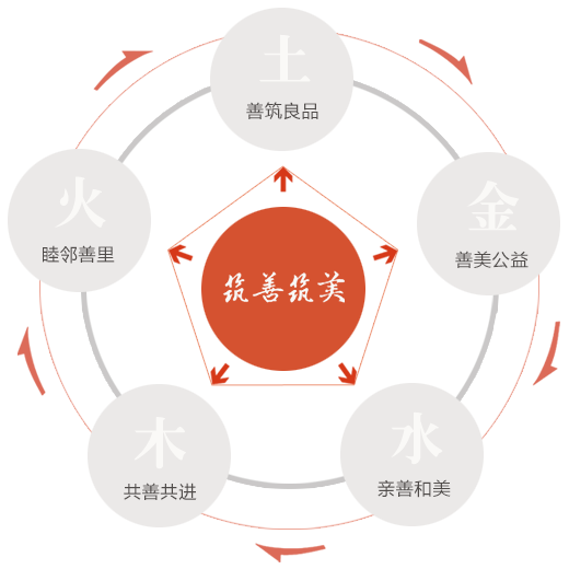 五行是中华民族最为朴素的辨证唯物的哲学思想,是以木、火、土、金、水五种物质为符号,表示事物运动变化的规律和属性。随着时代发展,ng电子娱乐亦秉承“筑善筑美”核心理念,将五行融入企业发展观中。以五行对应五维,从而形成生生不息的发展观。即植“木”成林,共善共进,与员工、合作伙伴、社会大众共同成长;“火”热邻里,打造多样、丰富、和谐的社区文化活动,成就睦邻善里的社区氛围;“土”厚载物,善筑良品,以更好的产品回馈城市与土地;“金”性洁净,以所寓意的纯净、真诚,持之以恒的践行国企担当,将善美公益的大爱持续传递;“水”纳万物,以卓越服务,缔建亲善和美的客户关系。